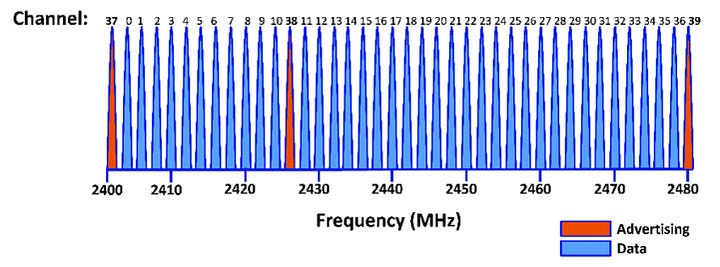 The new “Bluetooth Low Energy” (BLE) standard splits up the 2.4-2.5GHz spectrum into 40 “channels” (imagine these as different lanes on the Bluetooth highway), each 2MHz wide. The first channel is 2.402-2.404GHz, the second channel is 2.404-2.406GHz, etc. up until 2.480GHz. One transmitter is able to connect with up to 7 receivers at any moment in time, and they all communicate with each other on a single channel (though they jump between channels all the time to avoid interference, to learn more about that search for Frequency-Hopping Spread Spectrum). Bluetooth is therefore not ideal if you want to connect to a large number of peripheral accessories at the same time using one transmitter, and if there are many transmitters and receivers all using Bluetooth in one location, the channels can become very congested.