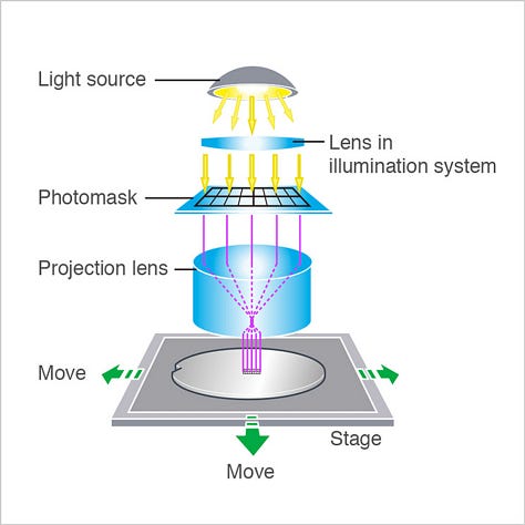 To print the same pattern across the wafer, the wafer is “stepped” from position to position until the entire wafer has been exposed to UV light through the mask. A single chip design may require a set of 10+ different masks to provide the instructions for the entire printing process, and the production of the blank photomasks is also a significant technical challenge due to the transparency required. Zeiss (Germany) is one of the leading manufacturers of blank photomasks.