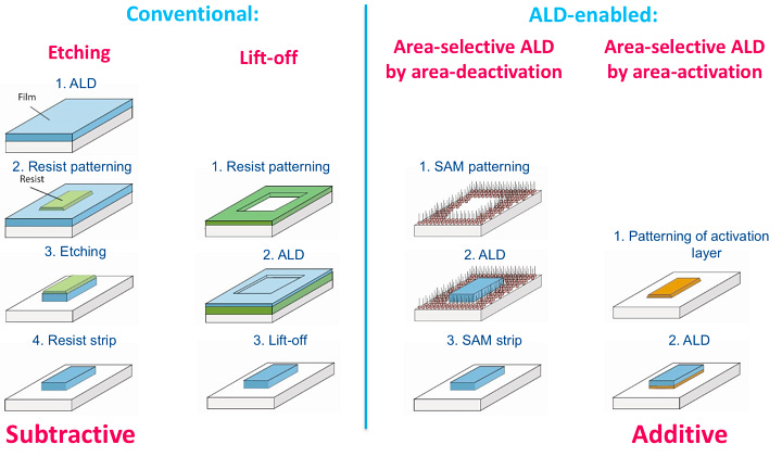 Deposition is another pattern transfer technique. One deposition technique is atomic layer deposition (ALD) aim to deposit lay-ers of individual atoms onto the wafer surface. Meanwhile, selective deposition techniques (such as “Area-selective ALD”) aim to deposit layers of atoms in exact places on the surface, as opposed to covering the entire exposed surface. Deposition at this stage of the manufacturing process is often done to place copper interconnects onto the chip.