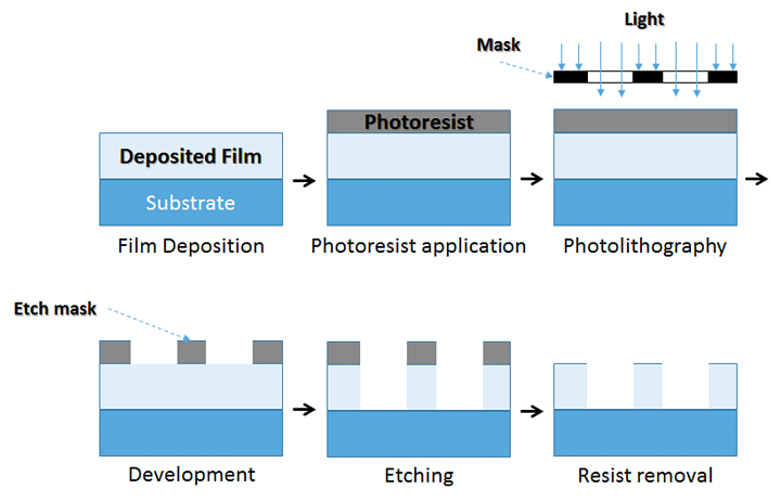 To transfer the pattern into the substrate (or a thin film deposited above the substrate), pattern transfer techniques are used. The most commonly used pattern transfer approach is etching, which involves using gases (dry etching) or chemicals (wet etching) to selectively remove material from a thin layer on the surface of the substrate. The remaining photoresist “resists” the etching process, protecting the underlying material, whereas the unexposed substrate or film is “etched away”, leaving the desired pattern in the underlying layer.