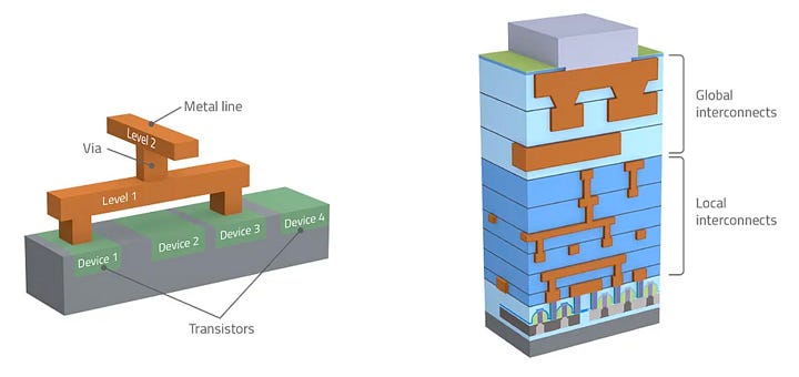 Most advanced chips today are comprised of many layers (up to 100!) stacked on top of each other with nanometer precision. To build these layers, the steps from deposition to photoresist removal are repeated to produce each new layer, which may serve many different functions within the chip.