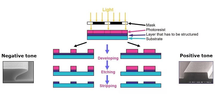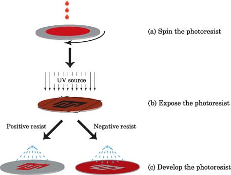 Photoresists are materials that change characteristics when exposed to various wavelengths of light. They’re used by fabs to create the 3D patterns on the wafer surface, by coating the photoresist onto the wafer surface and exposing only certain parts of the photoresist to UV light. Once the photoresist has been applied via a spinning process, the wafer is “soft baked” to solidify the photoresist (and evoprate any remaining solvents, from previous photoresist applications). Most fabs apply a “positive” photoresist coating, which deteroriate when exposed to UV light, and can then be removed with a solvent to leave the desired pattern on the wafer surface.